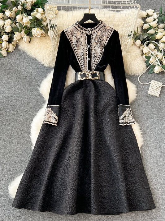 Demure Velvet Embroidery Dress