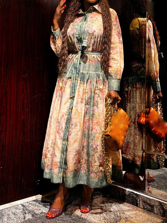 Single-breasted Long-sleeve Placement Print Lace-up Dress