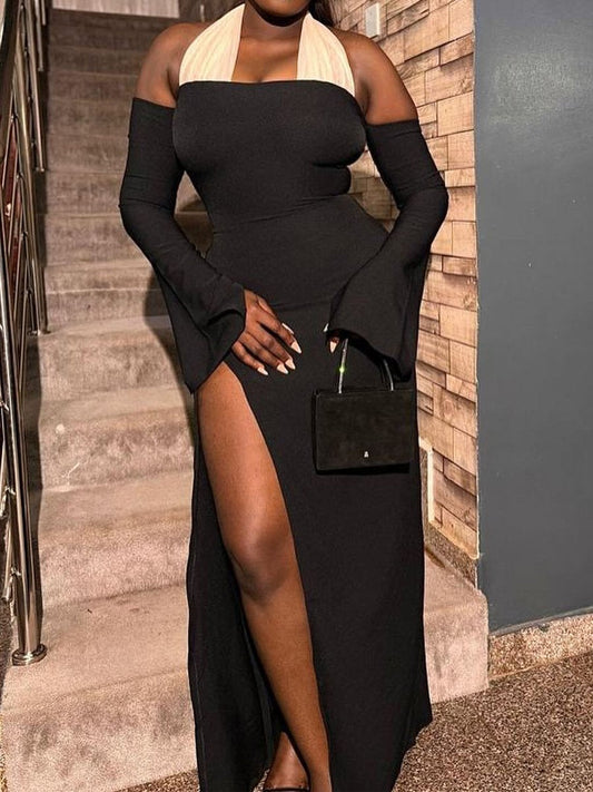 Sexy Halter Neck Long Sleeve Elegant Split Dress